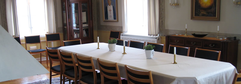 Hovedbygningen er et spennende hus med mange interessante detaljer og hemmeligheter... Man merker det allerede når man kommer inn gjennom døren og stiger inn i en romslig hall med en koselig sittegruppe foran et stort ildsted. Hele stedet er preget av fredfylt harmoni. Fra hallen ser man biblioteket og "kafeen" der man kan slappe av med en forfriskning under kurser og møter. Man får også et glimt av den store salongen som anvendes til møter. Ser man litt nøyere etter, vil man oppdage spennende bygningsmessige detaljer som håndmalte tapeter og håndlaget vindusglass. Første etasje rommer også kjøkken, trykkeri og kontorer.